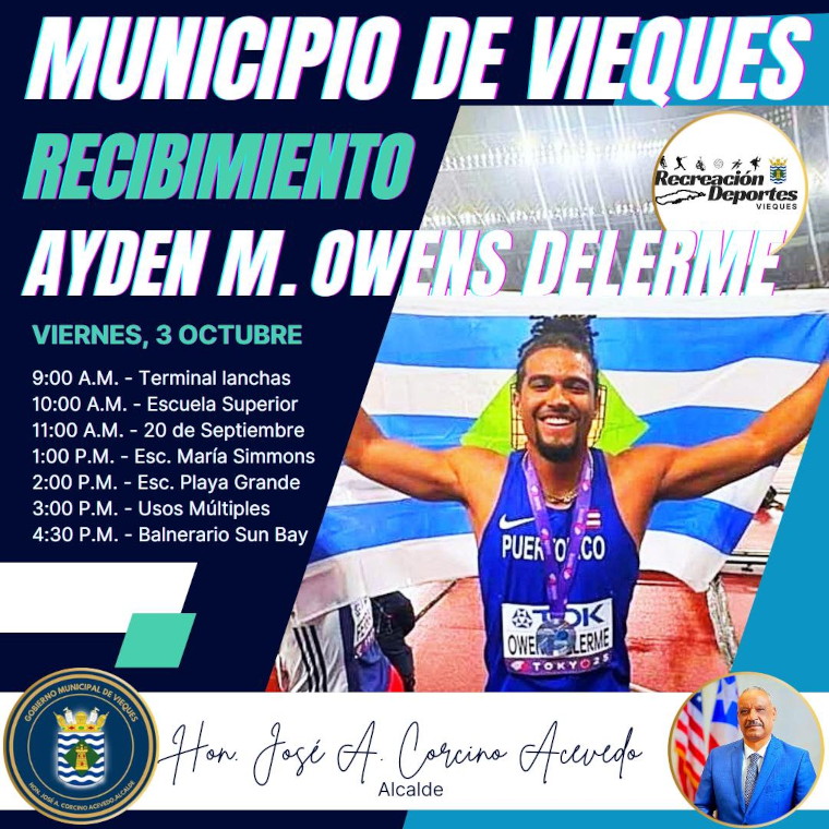 VIEQUES – La Administración Municipal de Vieques, encabezada por el alcalde José A. “Junito” Corcino Acevedo, junto a la Oficina de Recreación y Deportes Municipal, invita a la población a participar en la celebración dedicada al nuevo subcampeón mundial de decatlón, Ayden Owens Delerme.