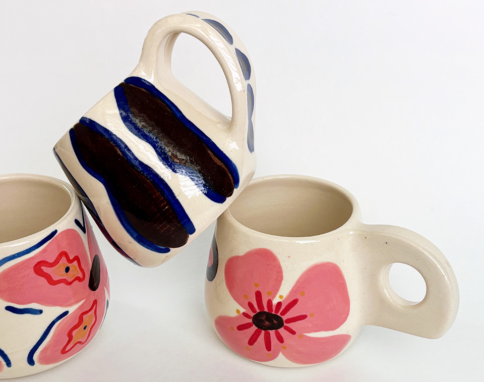 También trabaja platos, vasos ‘to go’, copas, set para hacer matcha, jarrones decorativos, piezas para inciensos y dominós, pero su enfoque principal son las tazas. La marca juega con dos estilos que representan la personalidad de la artesana; por un lado, están las tazas en colores neutros con un estilo ‘aesthetics’ que resalta por los diseños y formas y, por otro, están las tazas coloridas, con flores y patrones especiales.